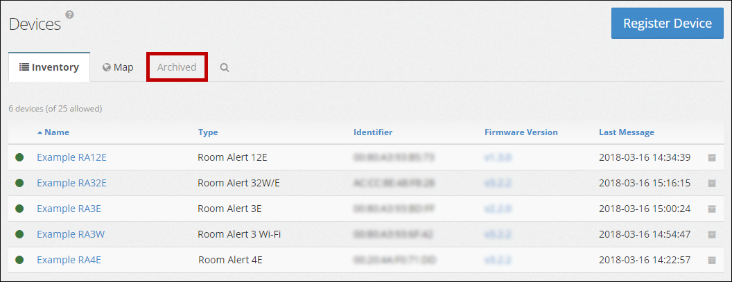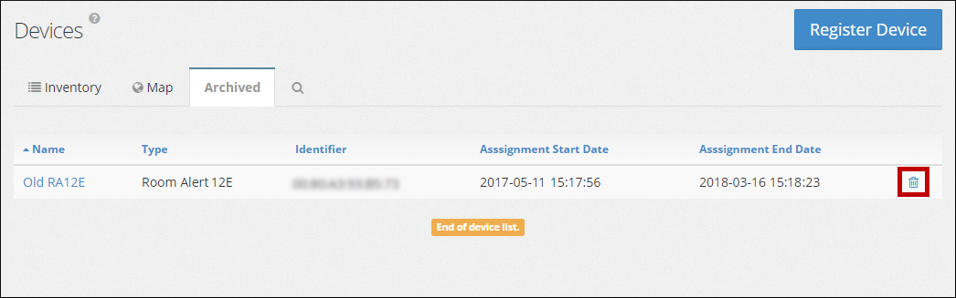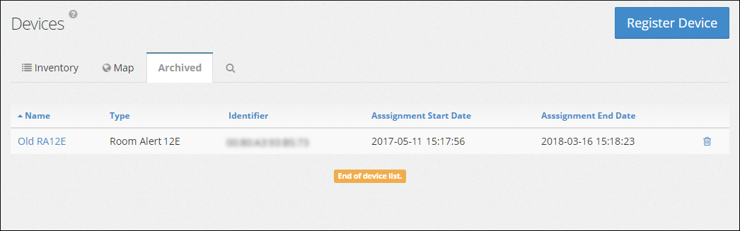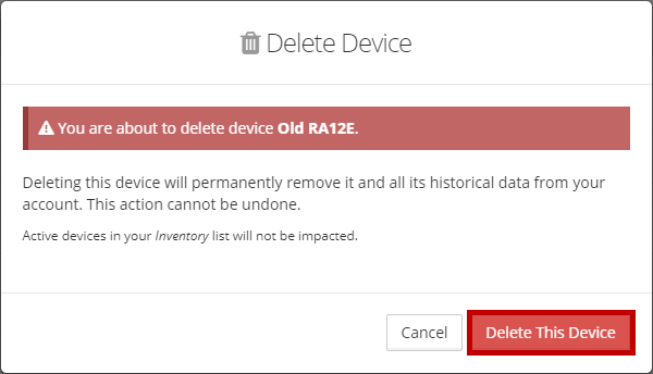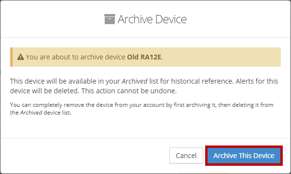 If you remove a device from your Inventory list, that device will then be available in your Archived list. In the Archived list, you may view and download historical data that was collected before the device was archived. Going forward, no new data for this device will be stored under the Archived list. Any existing alerts for this device will also be automatically deleted.