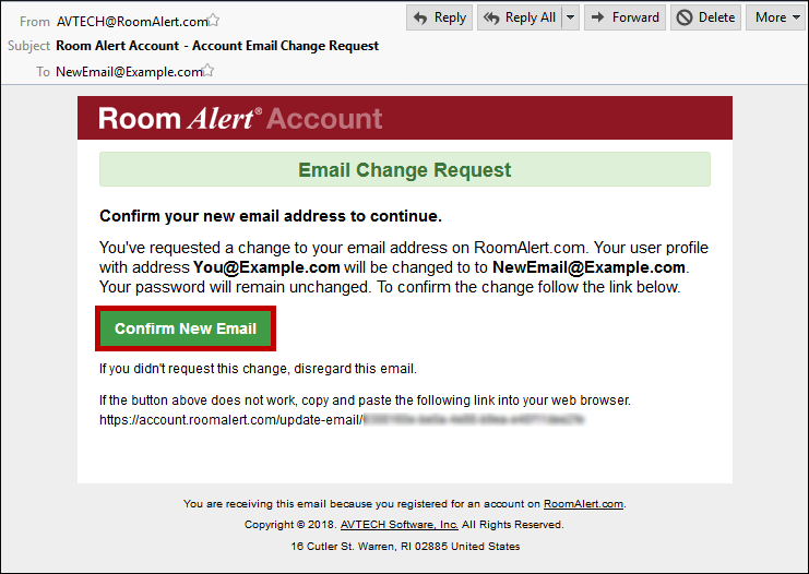 Use this new email address, along with your existing password, when you log into your Room Alert Account.