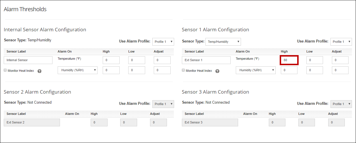 2. In the Alarm On section of the sensor’s interface, enter a value (or make a selection, depending on the sensor). In this case, we’re entering ’80’ in the Temperature High field.