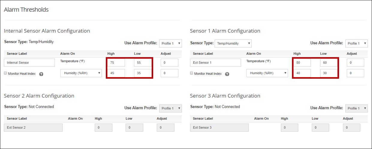 If you already own a Room Alert Monitor with existing alarm thresholds configured, you don’t need to change them; the device will automatically push to your Room Alert Account when the monitor goes into and clears those alarm states.