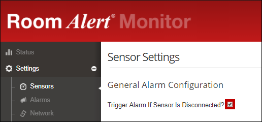 On the Room Alert 3 Wi-Fi, navigate to the Alarm Options –> Sensors page.