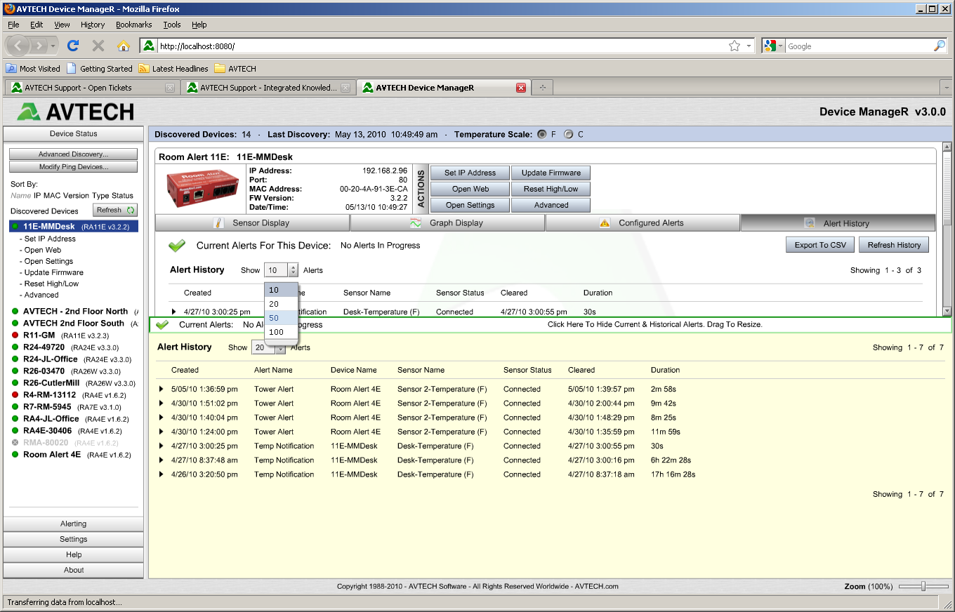 **Note** There is a drop down option for selecting the number of alerts that can be viewed. (10,20,50,100) This will depend on the amount of data that Device ManageR has polled/collected for the unit. If a device has recently been added, it will take several polling cycles to collect any information.