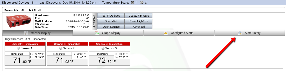 3. Toward the center of the screen you will see four tabs for your device. Click on the Alert History Tab to the far right.