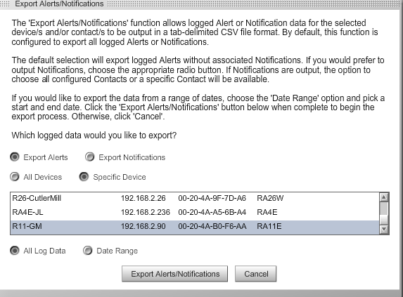 NOTE: Clicking on this function is similar to performing the same operation under the Settings>Alert Logging>Export Alerts/Notifications feature. The only difference is that the screen will be automatically configured for the actual device currently being viewed.
