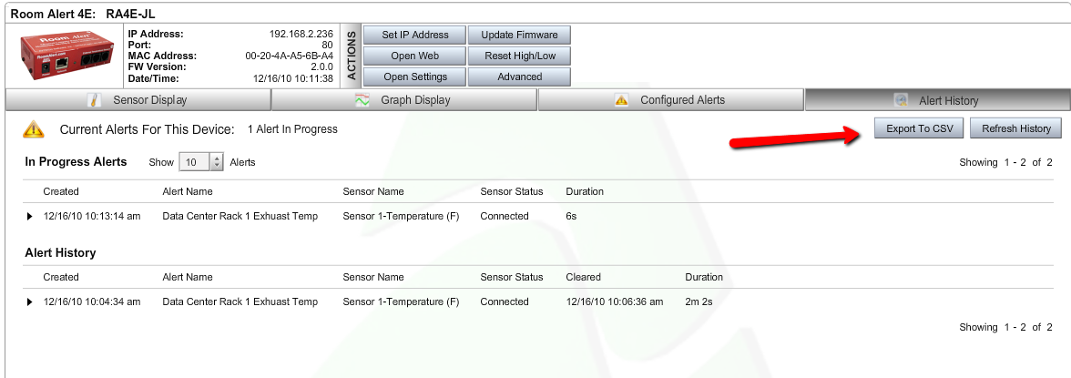 The Alert History Option allows you to view a quick snapshot of both the Current and Historical alerts of a discovered device. If desired, the history can also be exported to a CSV file.