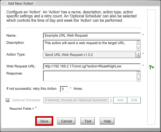 – In Action Type, select Send URL Web Request from the drop-down list. The unique options for this action type are the Web Request URL and Message fields.