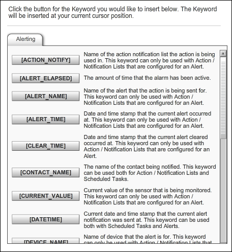 7. Along with your own static text, you may insert keywords if you wish, as we have in the example above. Keywords appear on the right side of the Edit Email Alert Text screen, displayed in capital letters inside brackets [KEYWORD]. Select the keyword’s button to insert it at your cursor’s last position in your text field.