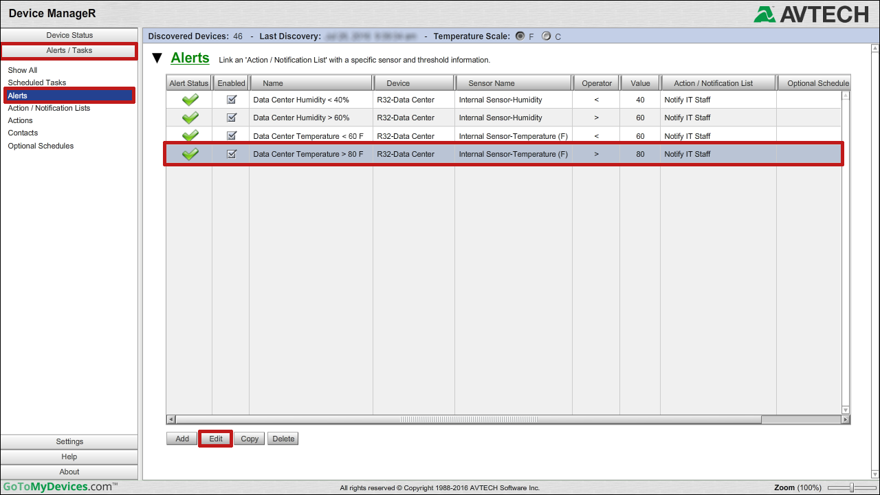 4. Highlight your alert by clicking on it once. Then select Edit from the bottom of the page to open the Edit Existing Alert window.