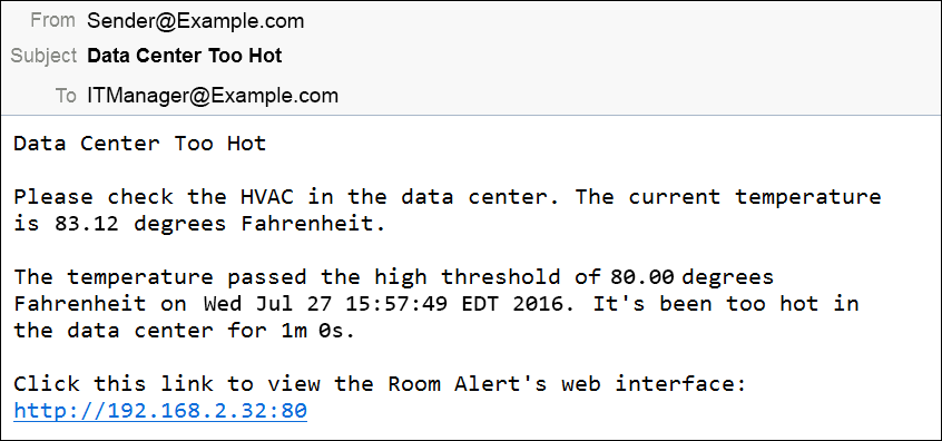 9. When you receive an email alert (or clear) message, it will contain the custom text you entered. Below is what our example custom alert email looks like: