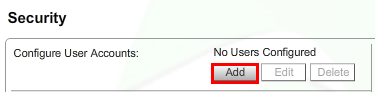 3. In the Settings menu, select Security to bring up the Configure User Accounts dialog box. Note that there are no users currently configured.