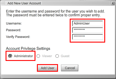 5. When the Add New User dialog box appears, leave Administrator selected under Account Privilege Settings.