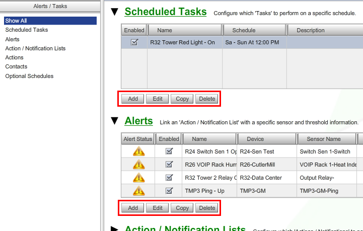 3. However, since a Viewer has read-only access, it cannot reconfigure the items in Alerts / Tasks. Notice that the Add, Edit, Copy and Delete buttons do not appear under the items in the Viewer’s Alerts / Tasks screen, preventing a Viewer from changing any settings.