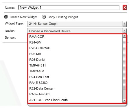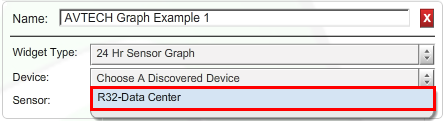 2. While a Guest can configure widgets in its own personalized Dashboard View, it has access only to the device(s) assigned to it. In this Guest’s view, only the allowed Room Alert 32E appears in the widget’s dropdown list.
