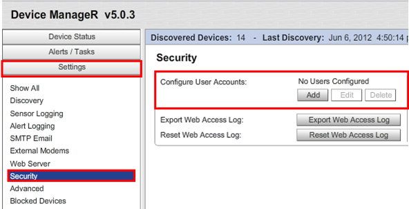 By default, Device ManageR does not require user accounts with user names and passwords. However, they are an option if you would like to add security in terms of who can reconfigure the program and who can see what data.