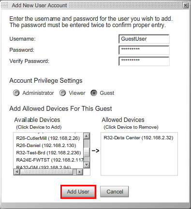 3. Once you choose Guest, you’ll also need to choose the devices the Guest has access to. Click on a device to move it from Available Devices to the Guest’s Allowed Devices list. In the example below, the Guest is being granted access only to the Room Alert 32E in the data center.
