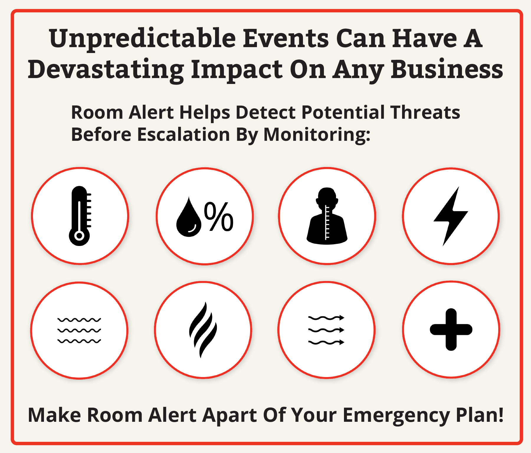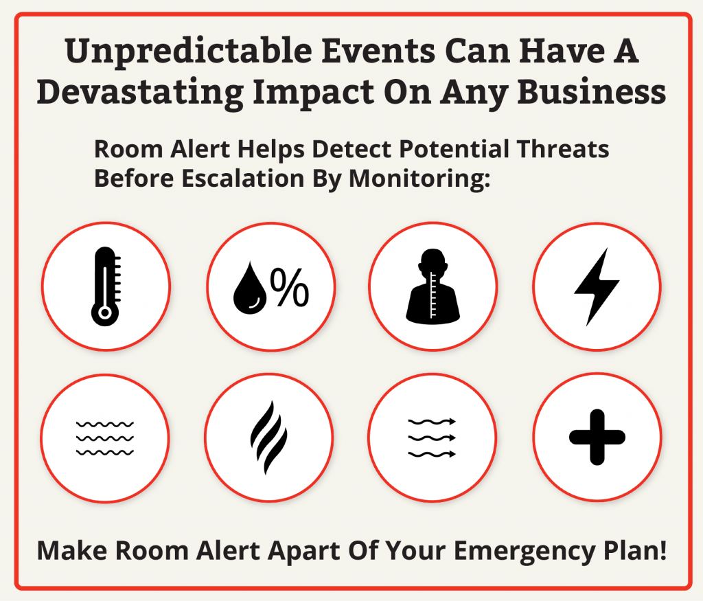 Room Alert environment monitoring is a vital component of any emergency plan. By continuously monitoring critical environmental conditions such as temperature, humidity, heat index, dew point, power, water/ flood, air flow, smoke/ fire and more, Room Alert helps businesses detect potential threats before they escalate into major disasters.