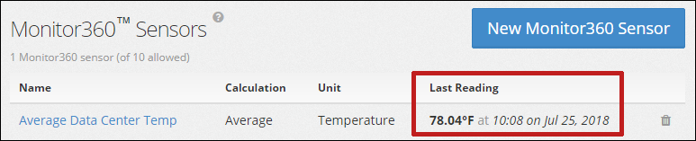 9. Your new Monitor360 sensor will then populate your Monitor360 Sensors list, showing the last reading for your calculated value. In our example, we see that the average of our 4 temperature sensors is 78.04° F as of the last reading: