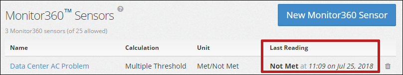 9. Your new Monitor360 sensor will then populate your Monitor360 Sensors list, showing the last Met/Not Met calculation for your set of conditions. In our example, we see that our conditions are Not Met: