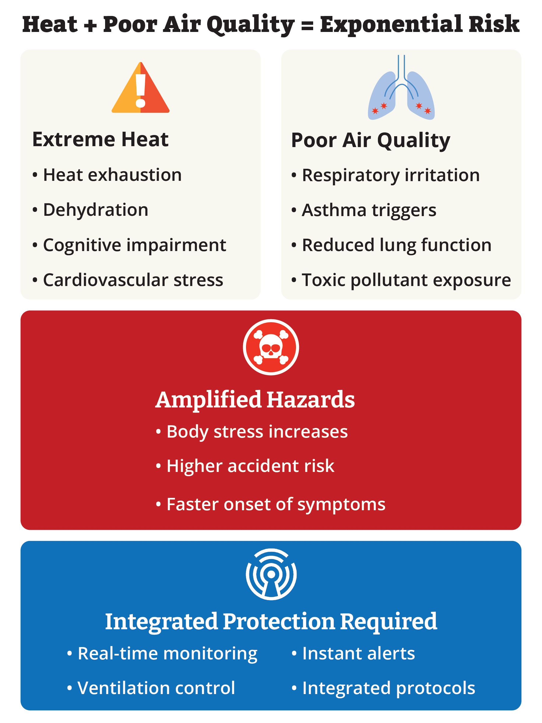 Heat waves are spiraling out of control, growing more frequent, intense and prolonged as global temperatures surge. While the immediate dangers of extreme heat such as heat stroke, heat exhaustion and dehydration, are increasingly recognized in workplace safety protocols, a silent and equally insidious threat often accompanies these sweltering conditions: poor air quality. This combination creates a “double whammy” for worker health and safety that demands a smarter, integrated approach to workplace protection.