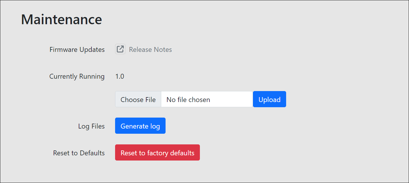 Firmware updates can be applied to MAX Base Stations through the device’s local web interface. (Currently, Room Alert Discovery utility can find MAX devices, but not update them. Room Alert Link and Room Alert Manager do not have support for MAX devices.)