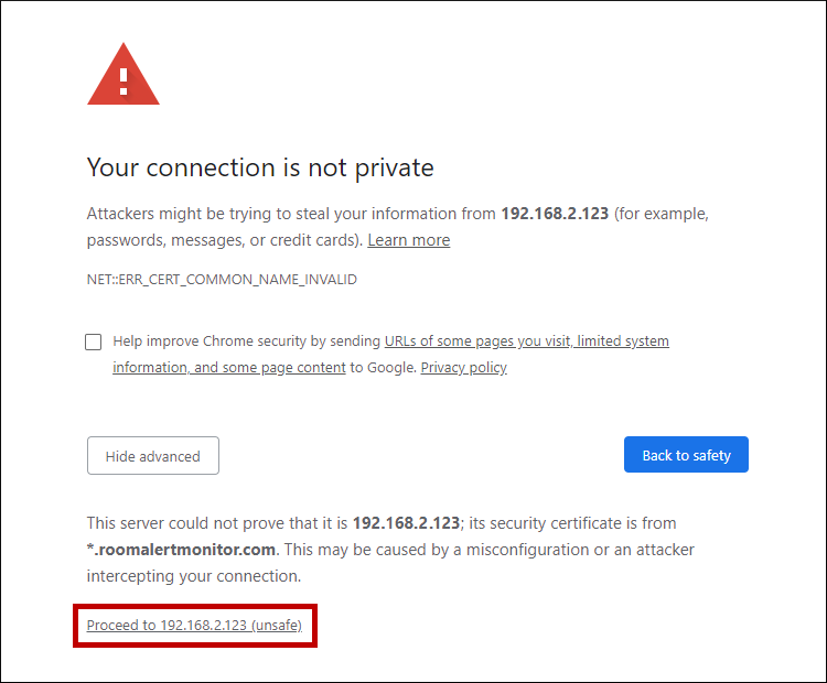 If you attempt to access your HTTPS-enabled device directly at its IP address or at a domain other than *roomalertmonitor.com, you will see a warning message in your browser.