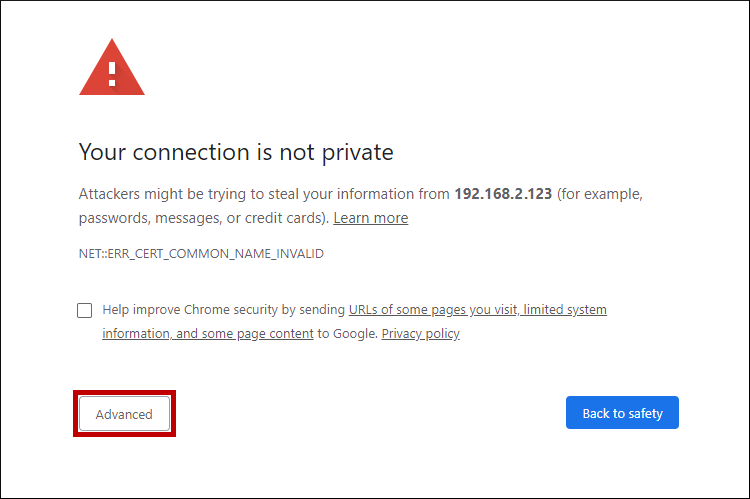 3. Select Proceed to <IP address> (unsafe) to open the device’s web interface.
