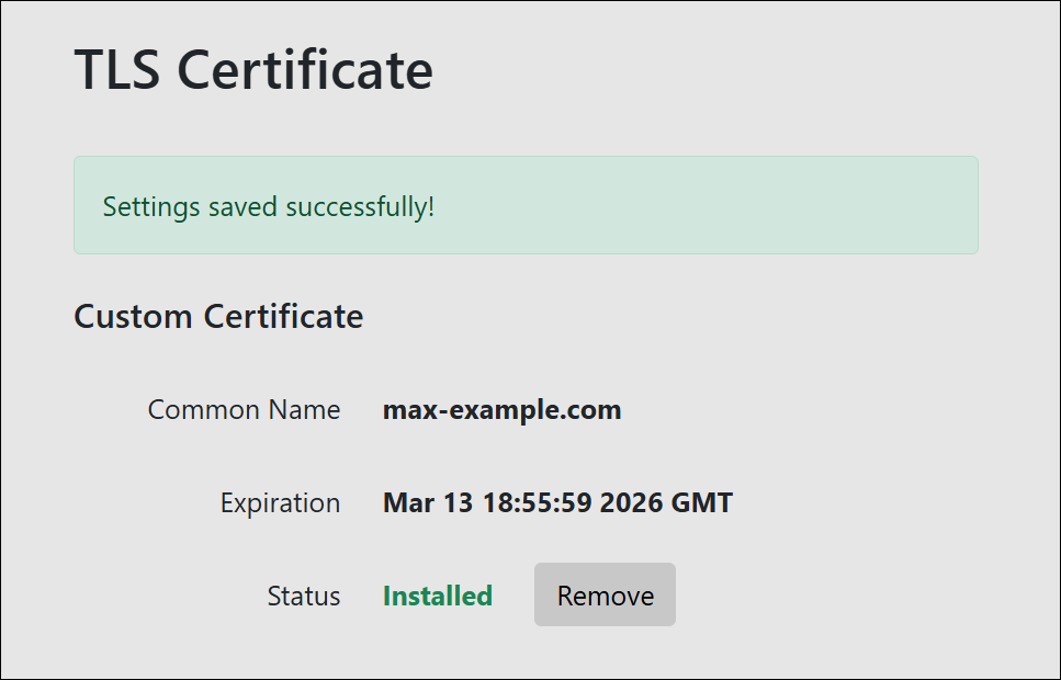 8. Once your certificate is applied, the Custom Certificate section of the page shows:
