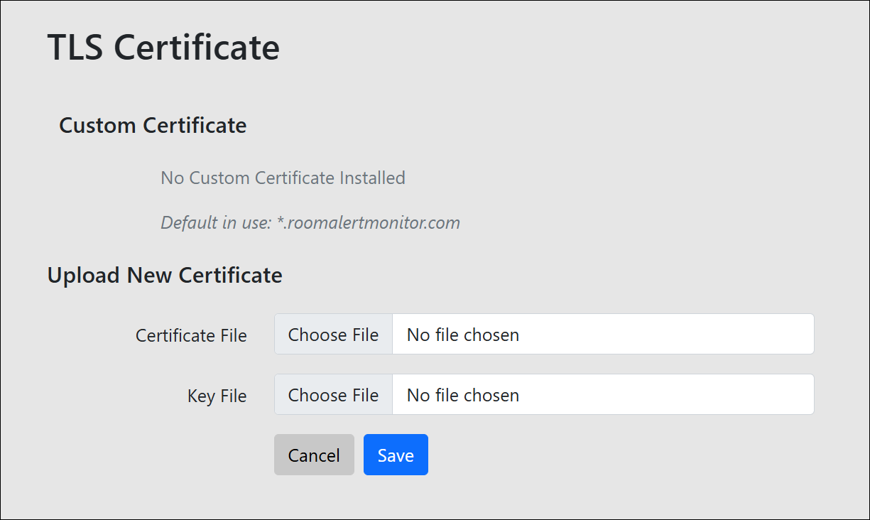 For a more secure local web interface, you can enable your Room Alert MAX, 32S 12S or 3S to use HTTPS. By default, your Room Alert Monitor’s local web interface is secured by an SSL certificate issued to *.roomalertmonitor.com. Room Alert MAX Base Stations also support custom certificates.