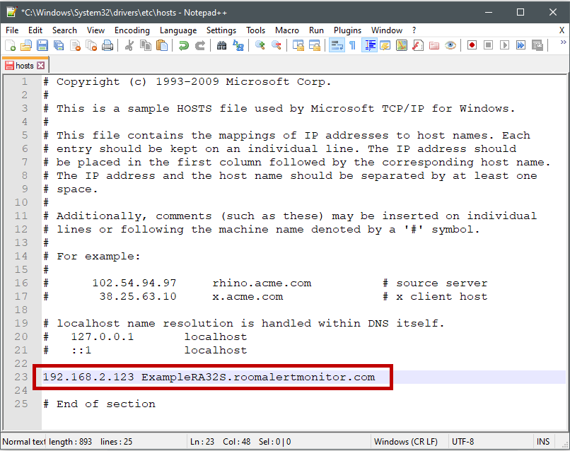 • In our example, we want our hostname to be “ExampleRA32S.roomalertmonitor.com” so we’re adding the following line to our hosts file: