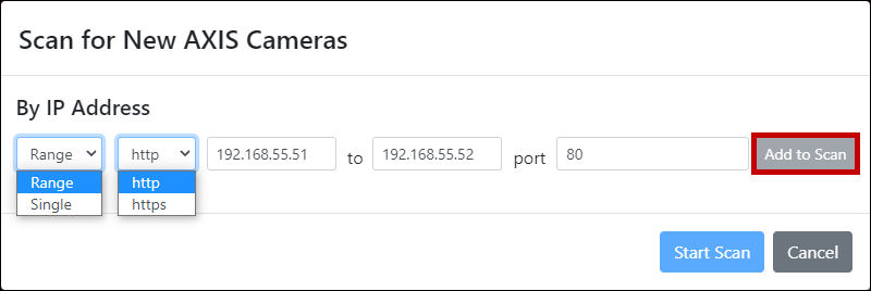 • In the first dropdown menu, select Range to scan a range of IP addresses or select Single to scan one IP address.