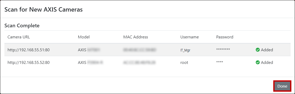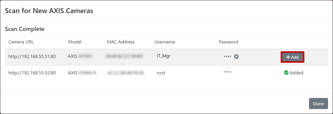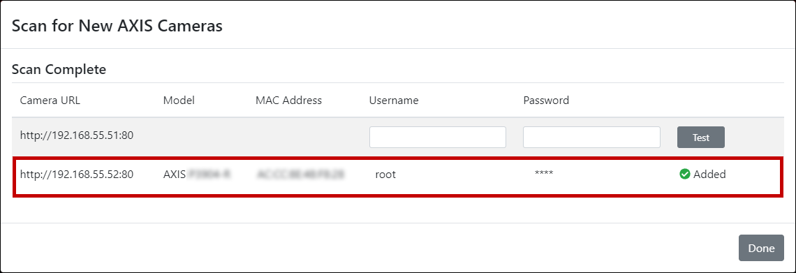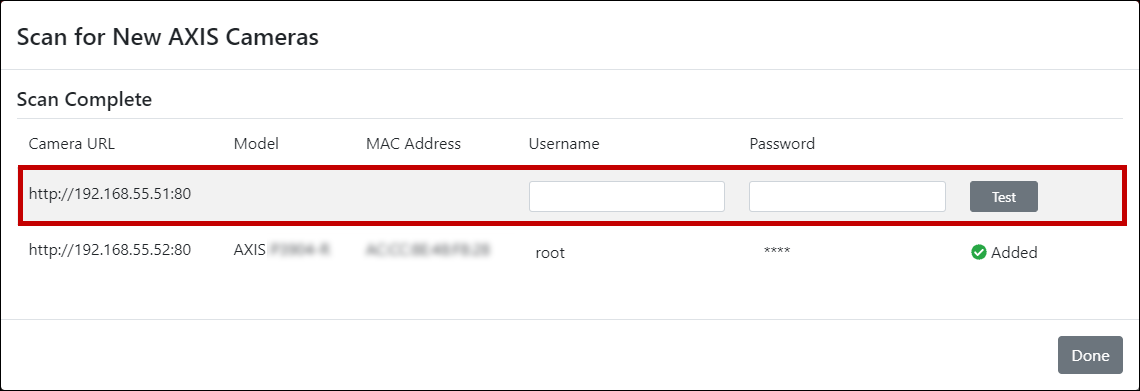 • Our scan found two Axis cameras. The first is configured with custom credentials. Therefore, its Username and Password fields are empty.