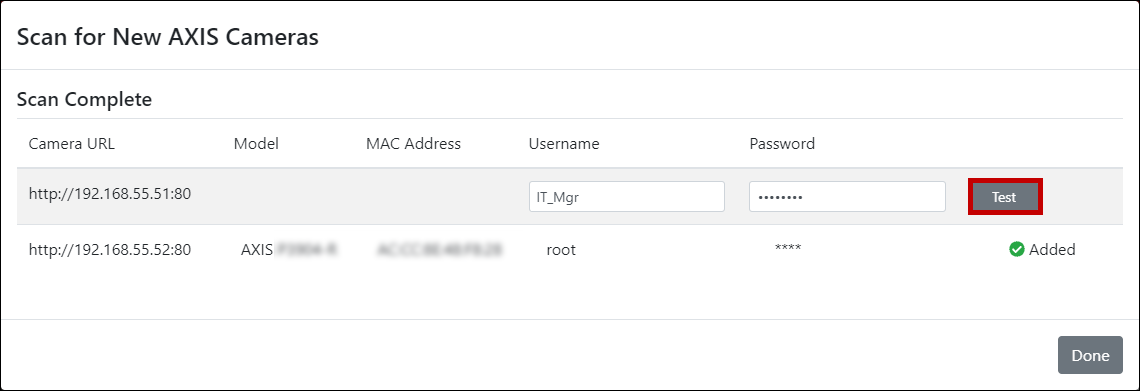 • For the camera using custom credentials, we need to enter its Username and Password, and then select Test to check that the credentials are valid.