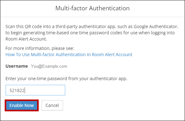 - Going forward, each time you log in to Room Alert Account, you will need to get the current code from your authenticator app.