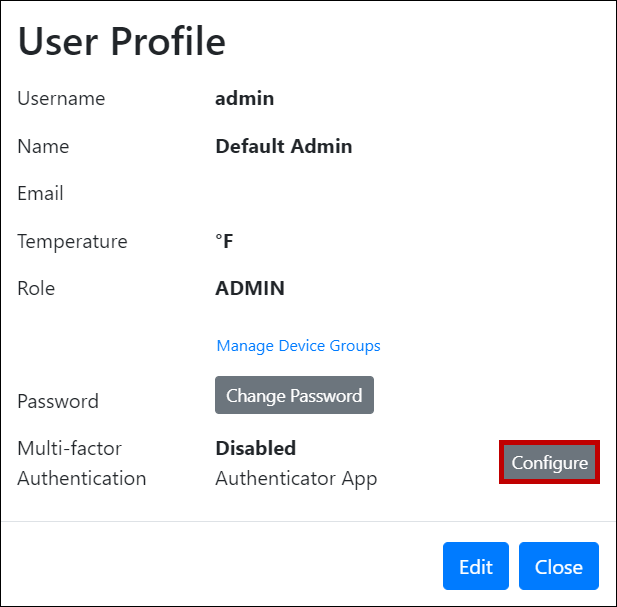 - In the User Profile window, select Configure next to Multi-factor Authentication.