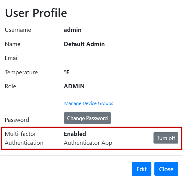 Room Alert Manager: Administrators can turn off multi-factor authentication for any other users.