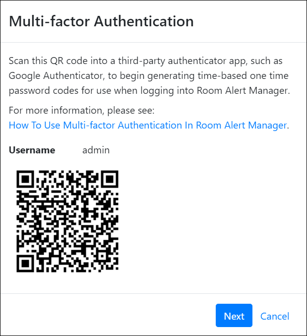 - Going forward, each time you log in to Room Alert Manager, you will need to get the current code from your authenticator app.