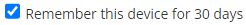 - You may bypass the MFA step on trusted devices by selecting Remember this device for 30 days during the login process.