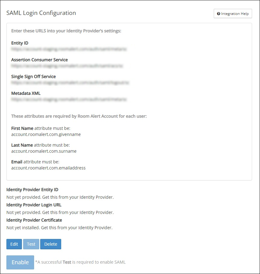 - Once the application is created, you can copy & paste each of the URLs from RoomAlert.com into your IdP: