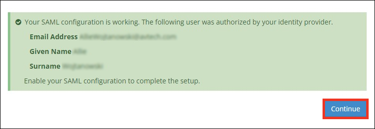 - Confirm that the message contains the correct information for the user you’re currently logged in as. Then select Continue to return to the SAML Login Configuration form.