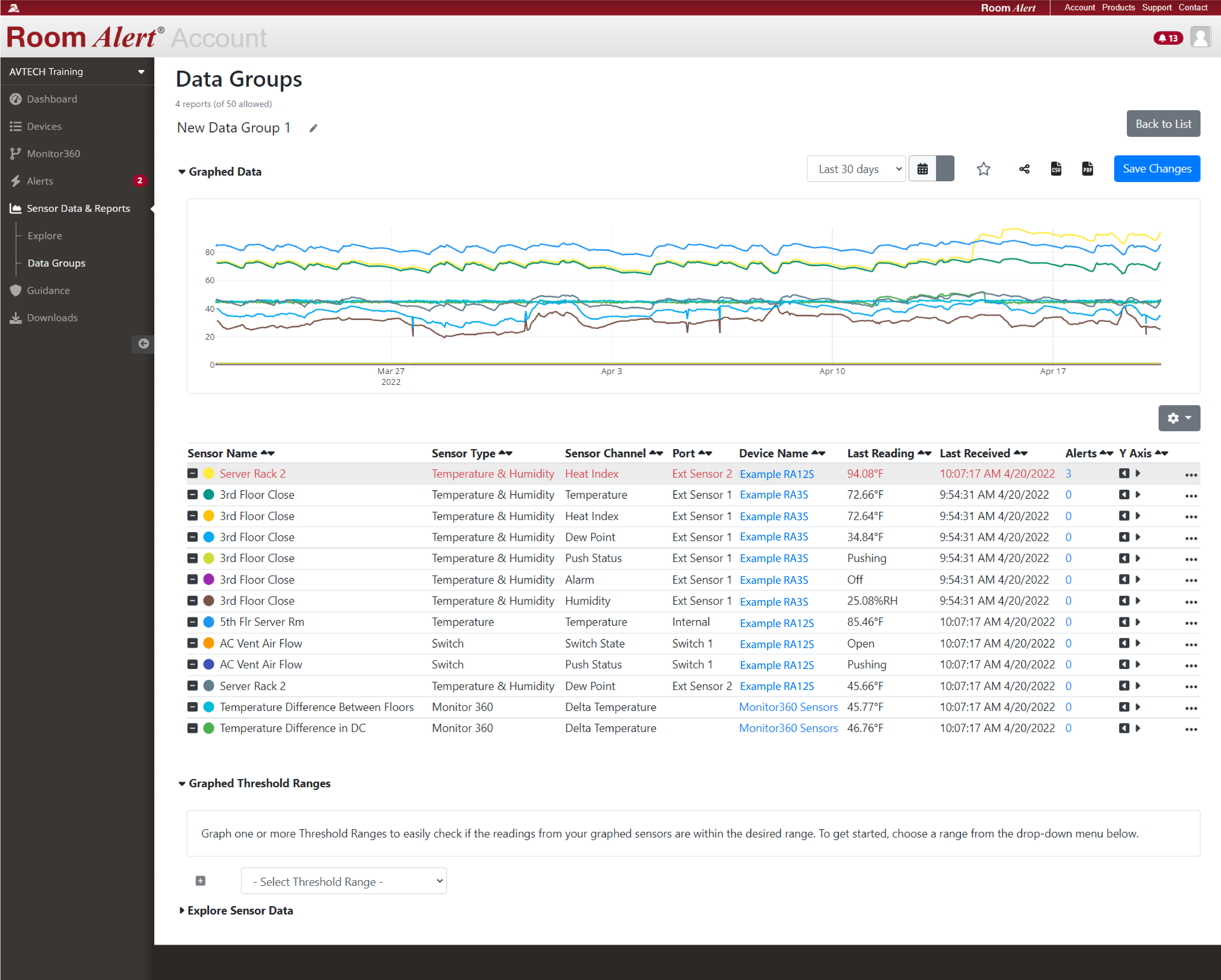 To maintain consistency between platforms, we are incorporating the “Sensor Data and Reporting” tab from Room Alert Manager into Room Alert Account. This includes the subcategories “Explore” and “Data Groups”. This tab is coming directly from what users are already familiar with, so here customers can