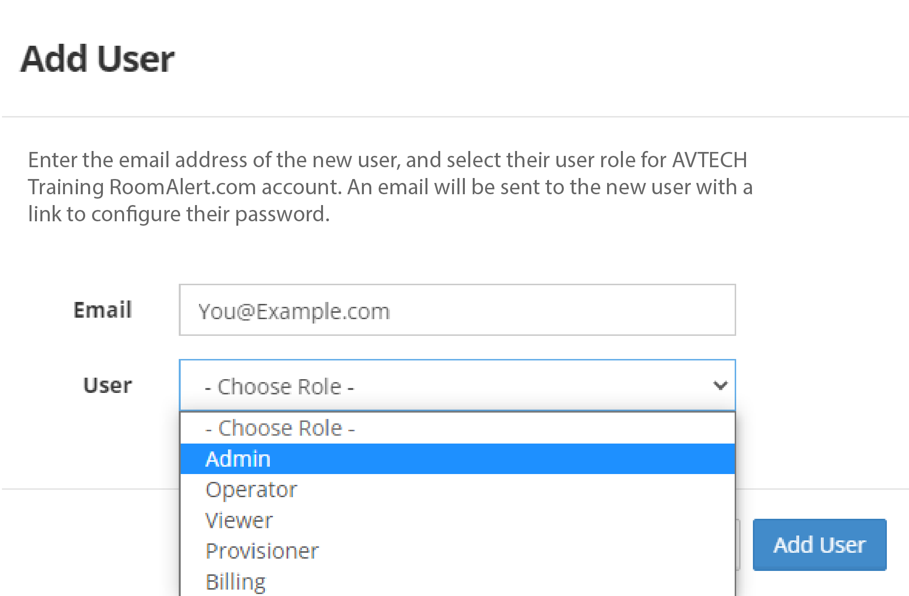 There are five types of user roles: Administrator, Provisioner, Operator, Viewer and a Billing role. An Administrator has full access to all features and settings within Room Alert Account. Administrators can manage other registered users by granting/revoking their access to the account, as well as changing their user role on the account. An Administrator cannot change their own role; they can only be demoted by a different admin on the account.