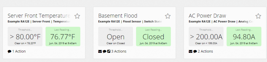 The first section you’ll see in your dashboard is your “Triggered Alerts”. This information is at the top of the dashboard in red because if you have any configured alerts that reach your predetermined threshold, it is important that users are notified immediately. By receiving notifications via text, email or HTTP post as well as posting the sensor information in your dashboard, users can be made aware of the potential threat and take corrective action to prevent or minimize costly downtime as soon as possible. From here, Room Alert users can do many things such as comment on alerts, multiple recipients and more.