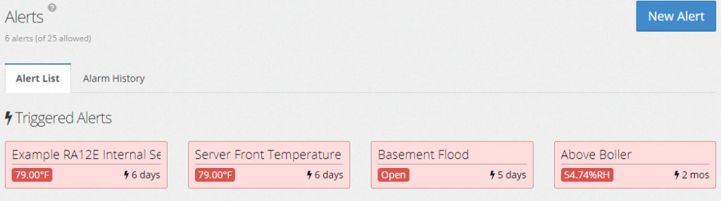 The final section in your RoomAlert.com dashboard is for Alerts. This alert section is for alerts that have not reached an alert state or been triggered. Room Alert Account users will see an Alert List of all of their configured alerts. Notice there is a star icon next to each alert; if you want to pin an alert or any combination of alerts to your dashboard, you can select the star icon. This will flag the alert or alerts and therefore make it even easier for users to access for future reference.