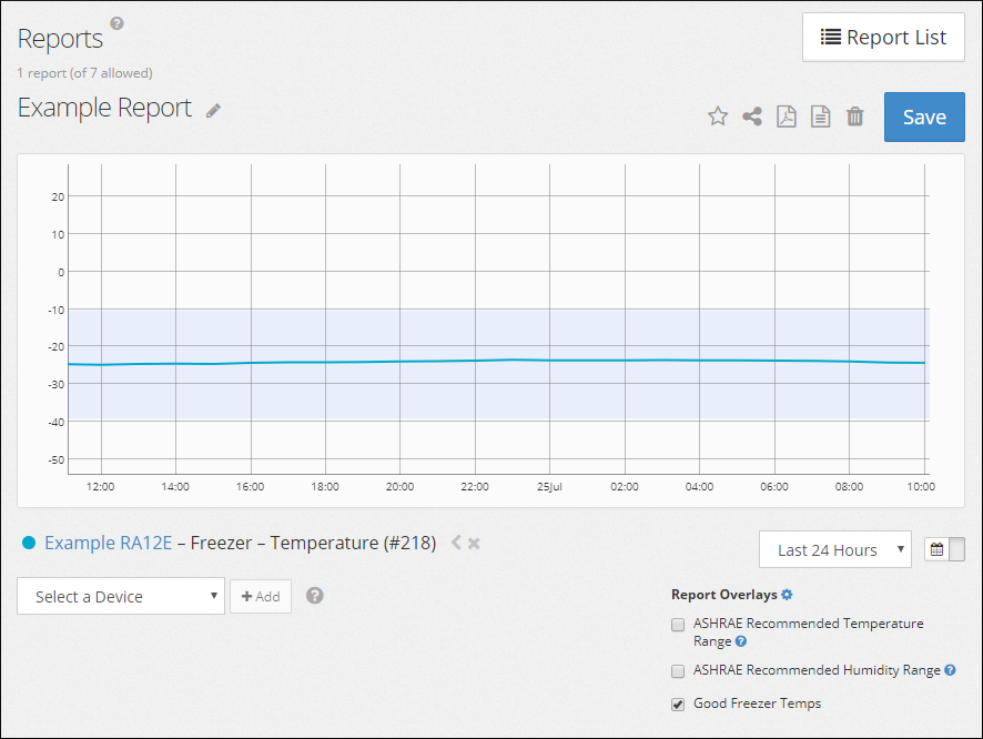 Storage freezers – Restaurants and storage facilities can set up custom report overlays to show the temperature ranges of their freezers to ensure they are within accepted parameters. Many storage facilities have specific guidelines and requirements they must adhere to; custom report overlays showing the temperature range required can show them the readings in all their freezers or refrigeration units, so they can determine if one or more of them are gradually rising in temperature. This could be an early warning of failure if it’s not inspected and serviced immediately.