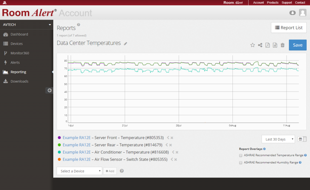 Reporting is another advanced feature where users can very easily and quickly graph Room Alert monitor and sensor data in a way that is simple and easy to understand. Creating reports is especially useful for employees who are more visual because users can customize their reports by