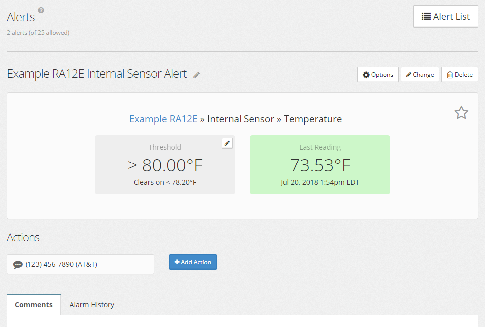 If your organization’s Room Alert Account has been upgraded to the Professional level or higher, you can add multiple actions to your alerts. This allows you to notify multiple contacts of alert conditions.