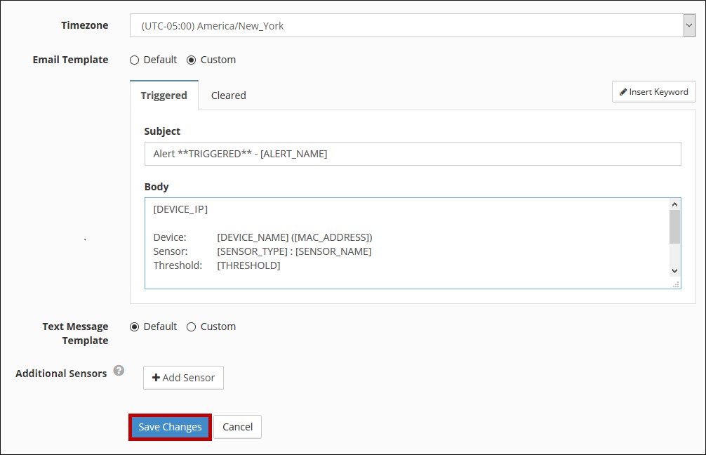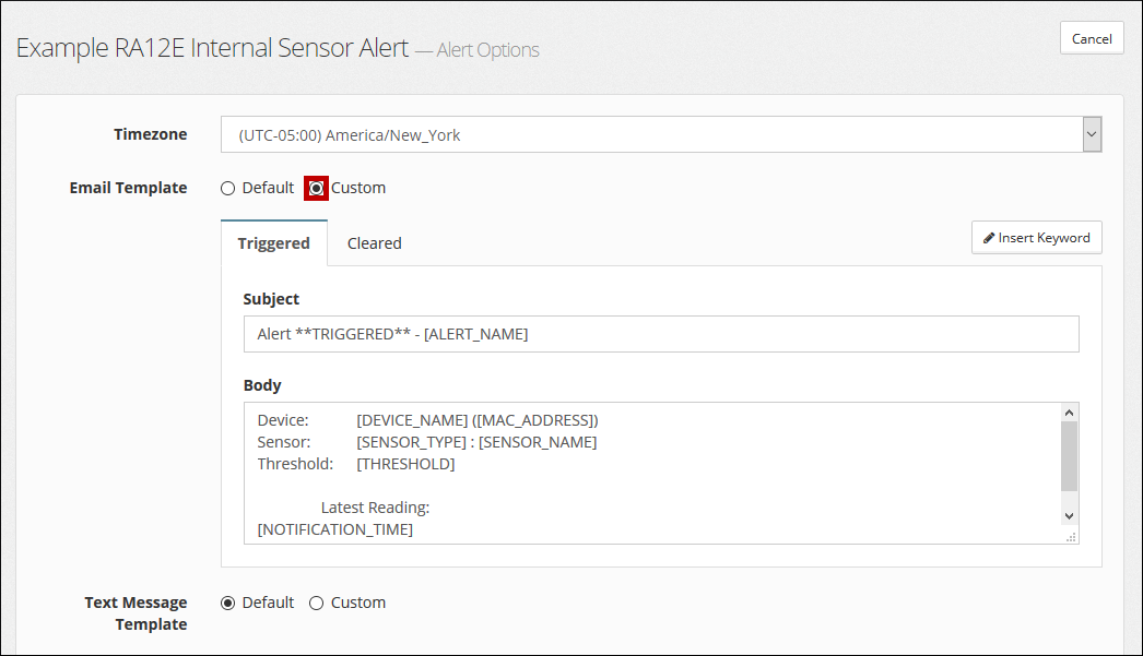 If your organization’s Room Alert Account has been upgraded to the Professional level or higher, you can customize email and text message alert notifications.
