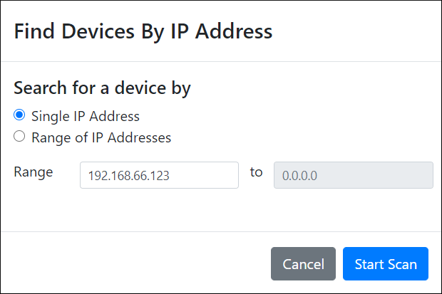 - Select Start Scan to begin scanning the single or range of IP addresses.
