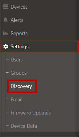 - In Room Alert Manager’s interface, navigate to Settings –> Discovery.