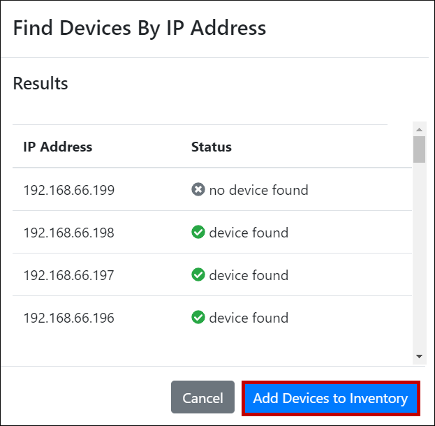 - Once the scan is complete, you’ll see a message telling you whether a device was found at each IP address.